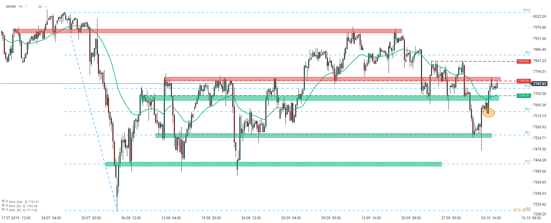 US100 index (NASDAQ futures underlying) bounced off the support zone at 38.2% Fibo level of July-August slump in the previous week. Subsequent recovery brought the price back above lows from end-September at 7700 pts handle. However, continuation of the upward move was halted at the resistance zone ranging 7760-7775 pts. The index tested this hurdle during today’s pre-market trading but failed to break above. Having said that, the potential trading range seems to be limited by 7700 pts handle from the downside and the 7760 pts handle from the upside. A break higher would pave the way towards the swing level at 7840 pts. On the other hand, failure to uphold the upward momentum and break below the lower limit of the range could hint at decline towards the latest local low at 50% Fibo level (orange circle, 7630 pts).