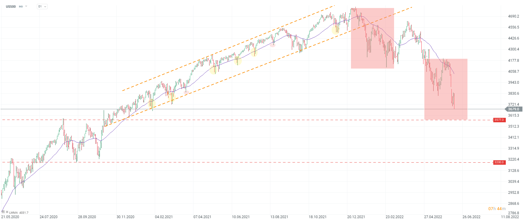 US500 has tumbled to the lowest since early 2021. The next major support is at around 3575.