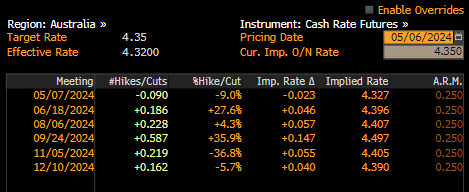 Economists surveyed by Bloomberg and Reuters expect interest rates to be left unchanged, with the cash rate staying at 4.35% for the fourth meeting in a row. Money market pricing also suggest that no cut will be made. Markets are pricing in just a 9% chance of RBA delivering a 25 basis point rate cut tomorrow. The latest hawkish data from Australian economy has greatly shifted pricing for the later parts of the year, with money markets now expecting rates to be left unchanged at current levels for the remainder of 2024.