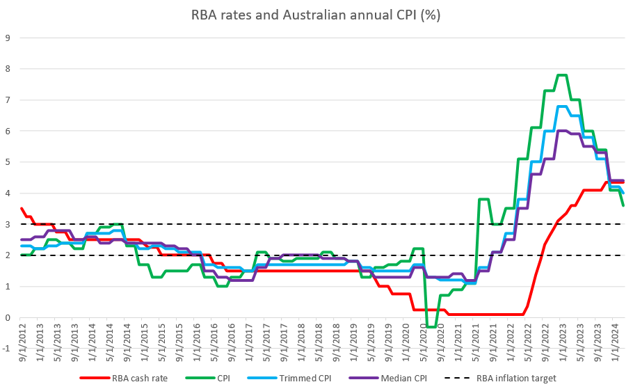 Previous RBA policy meeting was held on March 18-19, 2024. Bank left interest rates unchanged back than, with cash rate staying at a 12-year high of 4.35% for the third meeting in a row. Central bank changed statement and removed noted that 'further hike cannot be ruled out', and replaced it with note that 'it does not rule anything in or out'. However, data release since last meeting has been rather hawkish with labor market remaining tight and Q1 CPI data showing a smaller-than-expected slowdown. Inflation remains above RBA 2-3% target with economic continuing to fare well, so cutting rates does not look reasonable.