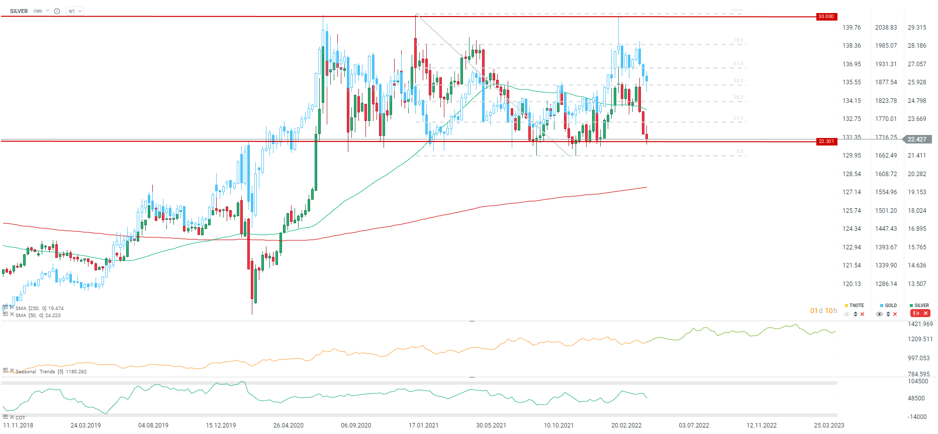 Correlation between stock and the precious metals markets is getting stronger partially due to wide use of ETFs. That is why the recovery in the stock market should be positive for silver and also for gold. Precious metals will also react strongly to price movements of the US dollar and yields. Silver is facing the key demand zone around $21.5- $22.3. Should stock market sell-off deepens and price break below this level, then downward correction may deepen towards $18.5 per ounce. However, if the situation in the markets stabilize, then silver may move towards resistance at $ 25 an ounce. Source: xStation5