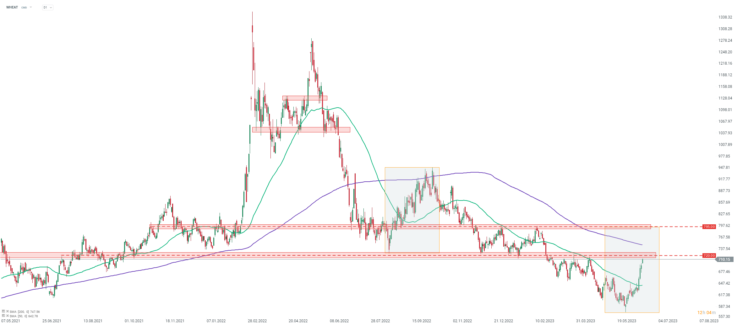 Taking a look at WHEAT chart at D1 interval, we can see that the price experienced strong gains recently and is now trading around 24% above a low reached at the turn of May and June 2023. Price is approaching a mid-term resistance zone in the 720 area that saw numerous price reactions over the past two years. A break above would lead to painting of a higher high - a potential break in the downtrend sequence. Nevertheless, price would need to climb above 795 mark for trend reversal to occur according to the Overbalance methodology. Traders should keep in mind that contract rollover will occur on WHEAT tomorrow and current futures markets quotes suggest it will lead to a price jump of around 14 cents per bushel.