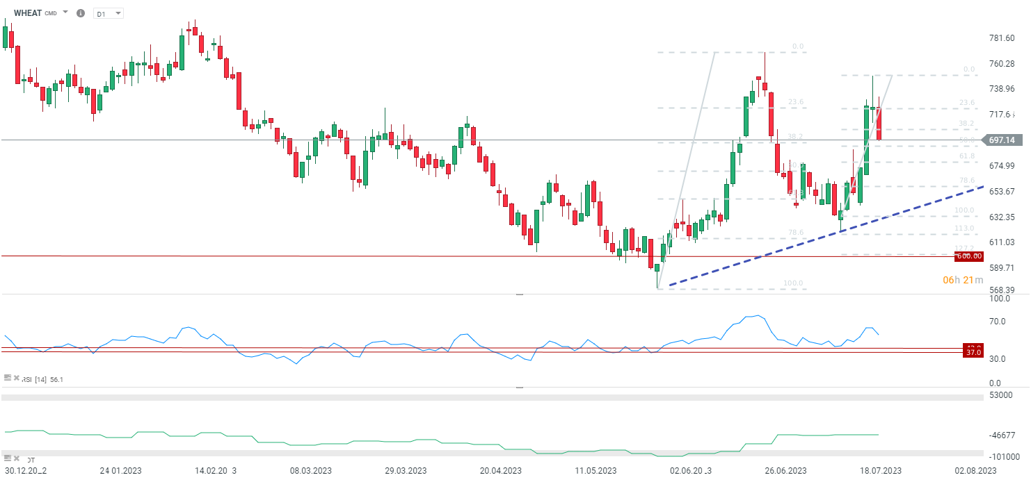 The increases at the beginning of the week were related to the failure to extend the agreement on agricultural exports from Ukraine. However, it is worth remembering that the situation is much different than last year - Ukraine is also exporting via other routes, and the production situation in Europe is much better than last year. Also in the US, USADA predicts higher grain supplies. Nevertheless, today's move is most likely a profit-taking reason, so next week the price may return to increases if basic wheather forecast in US will be unchanged - drought.