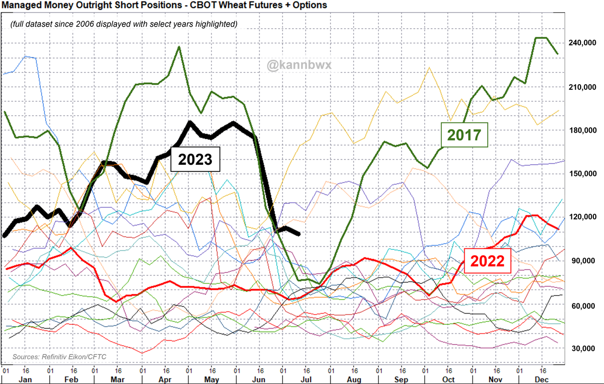 Due to seasonality elements such us harvest, drought risk, supply shocks etc. historically bearish positioning on wheat have sometimes cooled down in June and July. Source: Refinitiv, CFTC