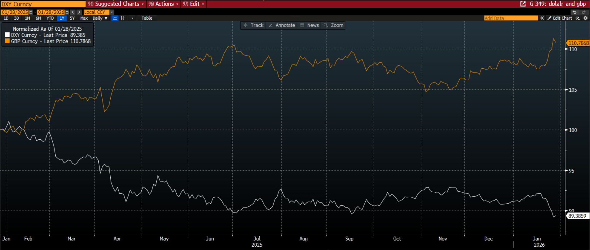Chart 1: Dollar index and GBP/USD, as the dollar has weakened, the pound has benefited.