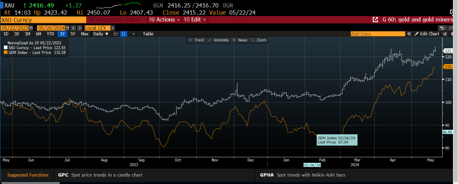Another interesting angle to look at is how gold miners are performing. The NYSE gold miners index, as you can see in the chart below (orange line), is moving in the same direction as the gold price, but this chart has been normalized to show how the gold price and the gold miners index has moved together. As you can see, there is a gap in the performance, which suggests that the share prices of gold miners could play catch up at some point.