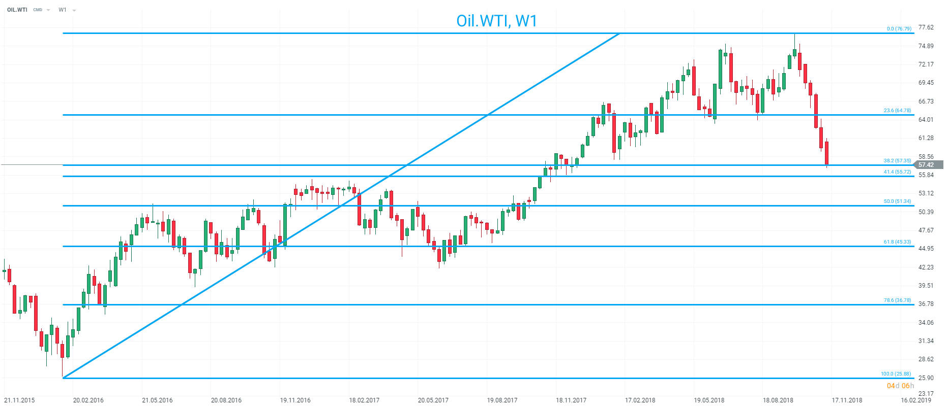 Oil.WTI has pulled back to an interesting level from a long-term basis with the market falling into the 38.2%-41.4% fib at 57.35-55.72. This region could be seen as possible support and any bullish reversal signals around here could represent attractive buying opportunities. Source: xStation
