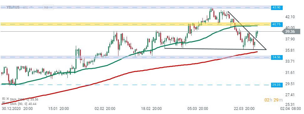 Yelp (YELP.US) stock broke above the upper limit of the triangle formation and is approaching local resistance at $40.75 which is additionally strengthened by 50 SMA (green line). Should a break above occur, then upward move could be extended to the $43.90 level where March highs are located. However if sellers manage to halt declines, then another downward impulse toward the support zone around $ 34.56 could be launched. Source: xStation5