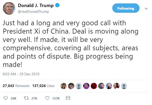 Donald Trump announced progress in trade talks via Twitter on Saturday. Source: Twitter