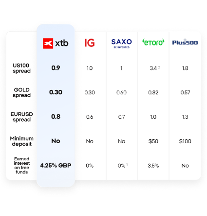 All data correct as of 22nd August 2025. All spreads listed are minimum spreads listed on each brokers website. If minimum spreads are not listed, we have taken the standard/average spread listed.