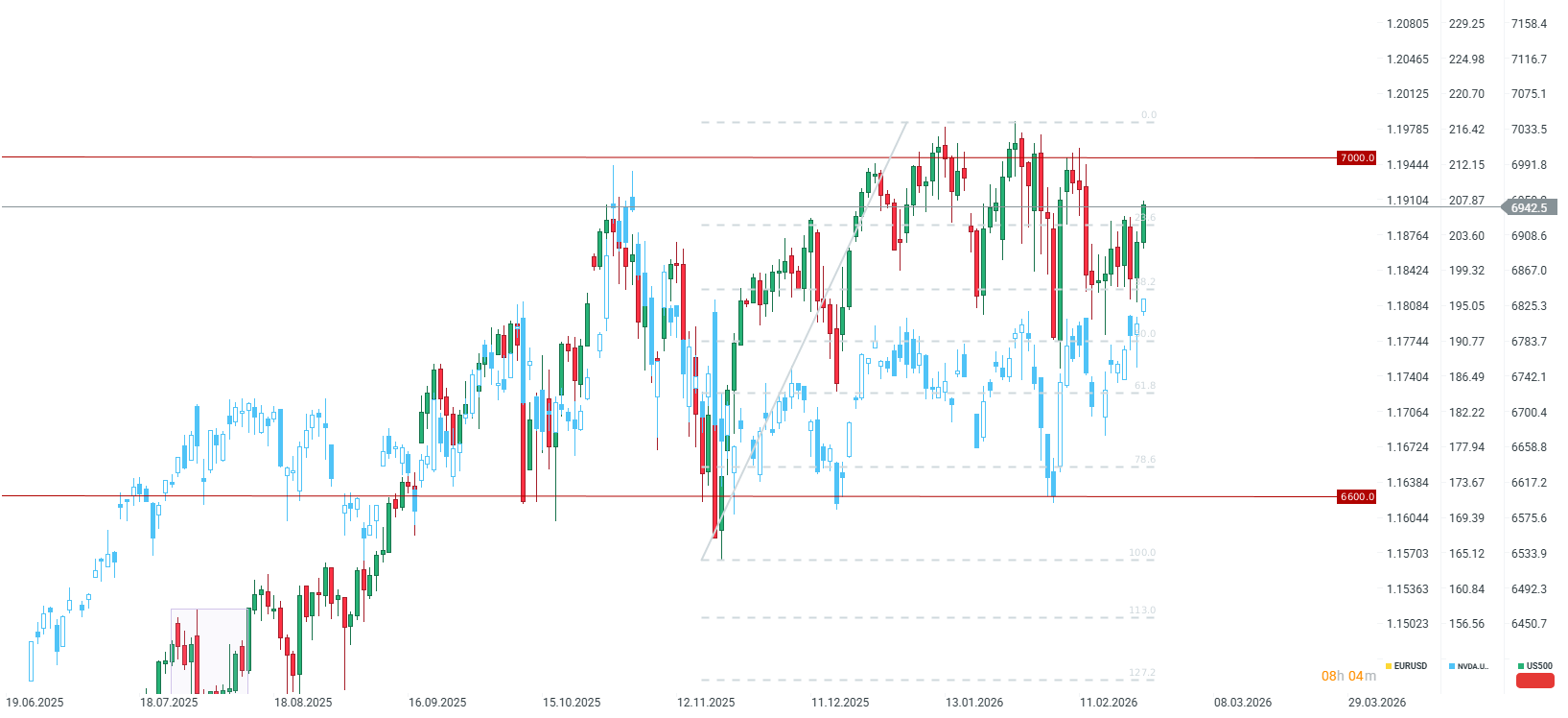 El S&P 500 ha superado recientemente al Nasdaq 100, impulsado por una rotación de capital hacia acciones defensivas. Sin embargo, las acciones tecnológicas lideran la tendencia en Wall Street hoy. Nvidia está saliendo de la consolidación y cotiza a sus niveles más altos desde noviembre, lo que permite al S&P 500 alcanzar su punto más alto desde la ola de ventas del 12 de febrero. Si Nvidia presenta buenos resultados, el S&P 500 tiene la posibilidad de alcanzar los 7.000 puntos, mientras que el Nasdaq 100 podría acercarse a los 26.000.