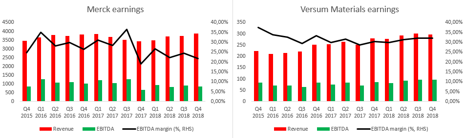 Sin embargo, no fue la sólida cartera de medicamentos de Merck o la sólida posición en el mercado de cristales líquidos lo que nos animó a prestar más atención a la compañía esta semana. Merck presentó recientemente una oferta de adquisición revisada para Versum Materials, la compañía química de EE. UU. Cabe señalar que la oferta anterior de Merck no solo se rechazó, sino que incluso Versum llegó a un acuerdo de fusión con Entegris, la compañía estadounidense que fabrica materiales microelectrónicos. Sin embargo, la prima que Merck ofreció sobre la oferta de Entegris era demasiado atractiva para ignorarla. La oferta de adquisición de Entergis tuvo un valor de $ 3.8 mil millones, mientras que Merck ofreció $ 5.8 mil millones, un 50% más de oferta. Como Merck es más de 10 veces más grande que Entegris y puede obtener fondos más fácilmente, este último, como era de esperar, se retiró de las nuevas licitaciones. Sin embargo, uno puede preguntar cuál es la razón detrás de la adquisición, ya que Versum Materials no opera en ninguno de los negocios principales de Merck. En medio del deterioro de las perspectivas de su negocio de cristal líquido, Merck Group decidió expandirse a otros materiales de rendimiento. La compañía decidió aprovechar la alta demanda de semiconductores y mejoró su cartera con activos que producen materiales necesarios para la producción de semiconductores. 2018 fue el primer año completo de tales operaciones y representaron alrededor del 4% de los ingresos totales de Merck. Sin embargo, es probable que esto cambie a medida que Versum Materials, la compañía que Merck adquirirá, se especializa en la producción de materiales necesarios para la fabricación de semiconductores. Versum Materials tiene un margen de EBITDA más alto y más estable que Merck Group, por lo que una adquisición tiene la oportunidad de aumentar la rentabilidad general de Merck.