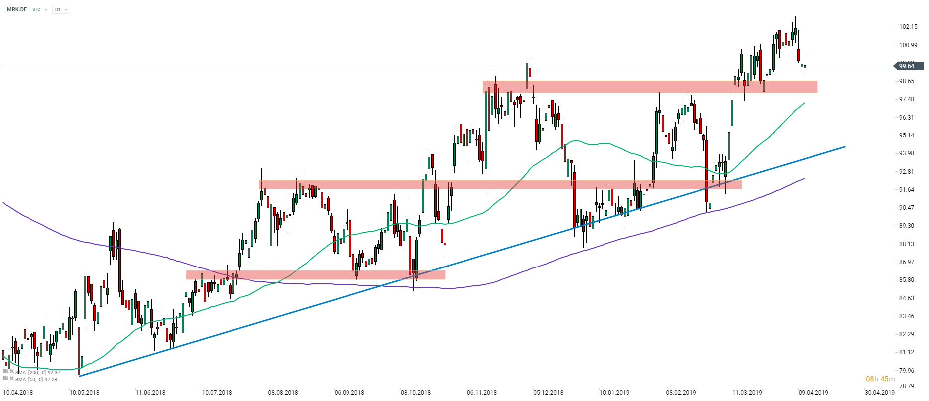 Merck (MRK.DE) ha estado operando dentro de una tendencia alcista desde principios de 2018 y se cotiza en un 10% más alto en lo que va del año. Tenga en cuenta que la acción ha reaccionado positivamente varias veces, tanto en la línea de tendencia con pendiente ascendente como en el promedio móvil de 200 sesiones, por lo tanto, puede ser conveniente hacer un seguimiento de estos niveles técnicos. Si bien el rendimiento fue estelar el año pasado, las acciones de Merck aún se cotizan unos 15 € por debajo de su máximo histórico. Fuente: xStation5
