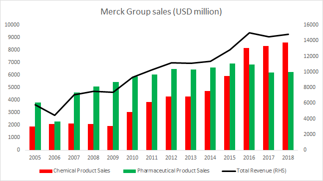 Durante siglos, la fabricación y distribución de medicamentos fue el núcleo del negocio de Merck Group. La compañía actualmente comercializa 11 medicamentos y tiene más de 30 en su cartera en las distintas etapas de los ensayos clínicos. Los productos de la compañía abordan una serie de enfermedades oncológicas y dermatológicas, así como problemas de fertilidad. El negocio de los medicamentos representó el 42% de los ingresos del Grupo en 2018. Sin embargo, la participación de este segmento en las ventas de la compañía ha estado disminuyendo durante algunos años a favor de la división de productos químicos de Merck. En este segmento se pueden encontrar operaciones centradas en materiales de rendimiento, como cristales líquidos o soluciones de proceso, incluidos servicios destinados a apoyar la investigación en ciencias de la vida. Merck Group fue un líder indiscutible en el campo del desarrollo y la fabricación de cristales líquidos durante mucho tiempo. La compañía tenía una participación de mercado superior al 60% antes de que comenzara a disminuir debido a la competencia de China. Las ganancias de los cristales líquidos disminuyeron junto con la participación de mercado, pero el segmento siguió siendo una parte crucial del negocio de la empresa.