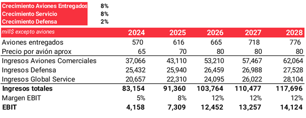 Por todo lo expuesto anteriormente y el nivel del que parte la compañía, estimamos que el crecimiento de las entregas de aviones comerciales crecerá con fuerza.