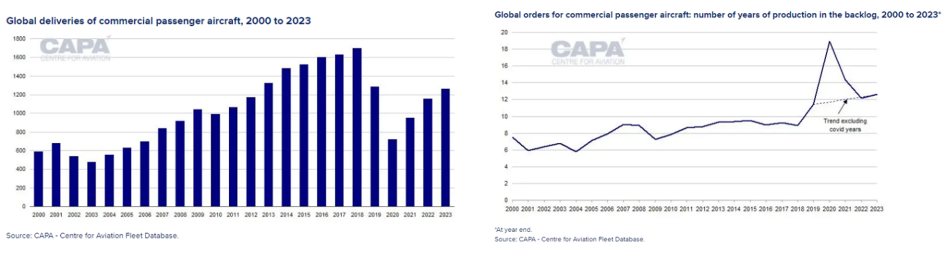 Todo esto ha provocado que los pedidos de aviones se hayan acumulado hasta tal nivel en el que se tardarían 12,6 años en entregar los 15.933 aviones pedidos al ritmo actual de producción.