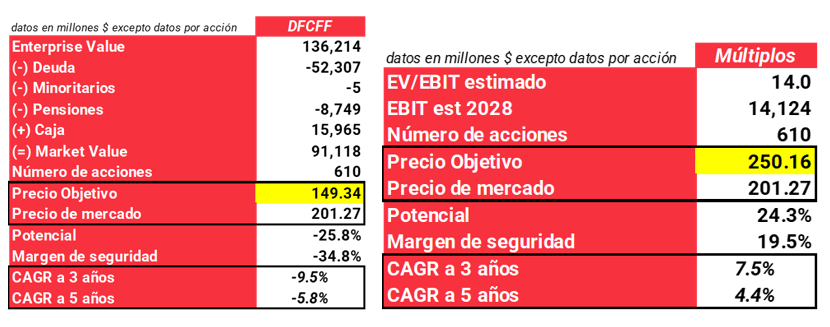 Por su parte, el valor estimado por múltiplo es de cara a 2028, aunque le seguimos viendo poco potencial para el riesgo que tiene la compañía.