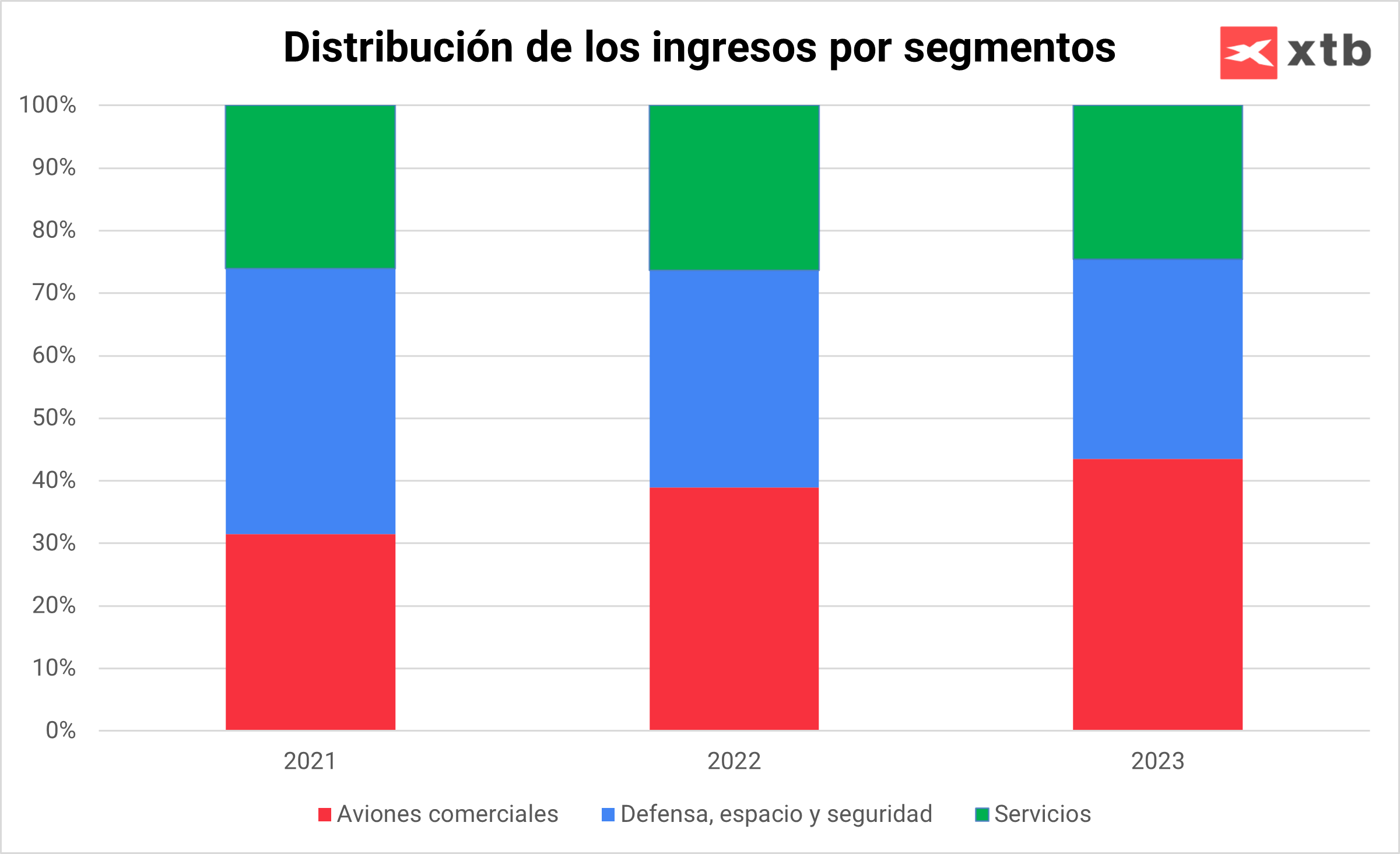 - Servicios: concentra todo tipo de servicios relacionados con los aviones, desde mantenimiento o repuestos hasta análisis de datos. Representó el 24,6% de los ingresos en 2023 y fue el único segmento con beneficio operativo, en concreto, de 3.329 millones de dólares