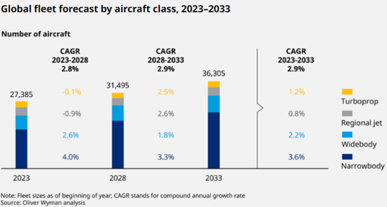 Por ello, las perspectivas de un aumento de la demanda de aviones es clara. Aunque no tendremos que esperar mucho para comprobarlo, puesto que en el 2023 se realizaron los mayores encargos de la historia del sector. Los protagonistas fueron IndiGo y Air India, que encargaron 500 y 470 aviones respectivamente. A todo esto, hay que sumarle la variable medioambiental, que está obligando a las compañías a sustituir los modelos más contaminantes por otros nuevos, más eficientes y más limpios, hasta el punto de que se estima que la mitad de la demanda hasta 2042 será para sustituir la flota actual. Pero ¿cómo de fuerte será la demanda? En concreto, se estima que en los próximos 10 años se entregarán 20.600 aviones nuevos, y según Boeing, se necesitarán 42.595 aviones nuevos hasta 2042. Por tanto, podemos afirmar que claramente los fabricantes de aviones pueden ser los ganadores de toda esta tendencia.