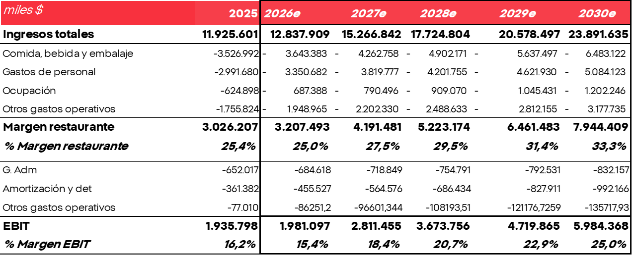- Creemos que el margen restaurante verá un deterioro en el 2026 por el aumento de los costes de los alimentos y el anuncio de la propia empresa de que no compensará toda la subida con incrementos de precios de los productos. En cualquier caso, a medida que avanzan los ingresos debería ganar escala y expandir margen, hasta alcanzar el 30% en el 2029. Por su parte, los 4 millones de ingresos medios por local vendrán en 2030. Estimamos que el periodo acabaría con unos 6.219 locales.