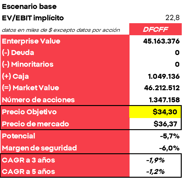 Hemos realizado un descuento de flujos de caja de los próximos 5 años más un valor terminal. Nuestro precio objetivo para las acciones de Chipotle es de 34,3$ por título, lo que está ligeramente por debajo de los 36,37$ actuales a los que cotiza la compañía. Por tanto, a pesar de que la compañía tiene unos retornos sobre el capital invertido muy altos y márgenes sólidos, el precio actual hace que la inversión no sea atractiva. De hecho, el binomio riesgo/beneficio no es favorable ya que incluso nuestro escenario base descuenta que la compañía volverá a crecer alrededor de un 15% anualizado en ingresos y en más de un 20% en EBIT.