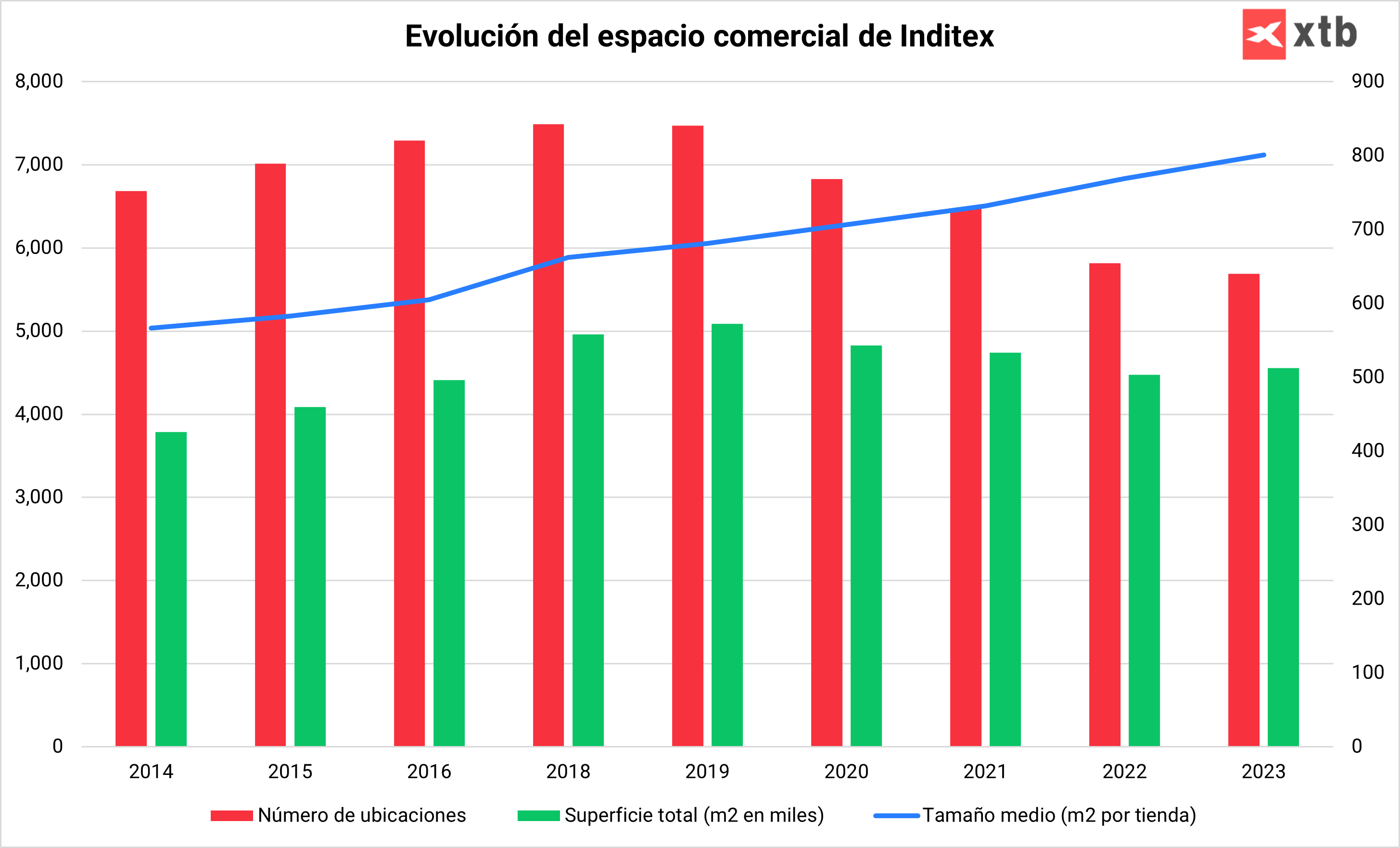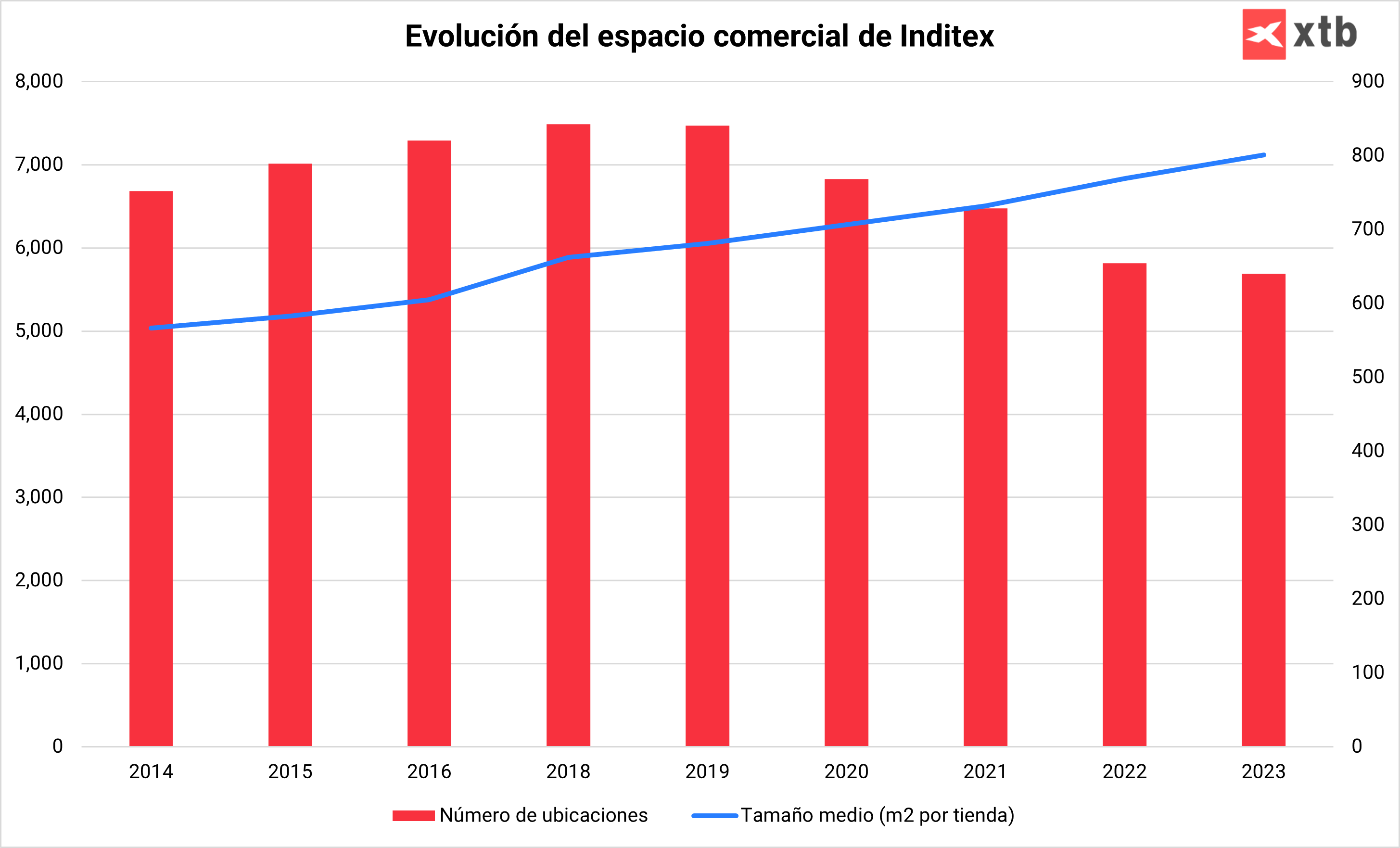 Pero lo más importante de Inditex es su modelo de negocio, que le ha permitido construir una fuerte ventaja competitiva basada en la flexibilidad y su capacidad para adaptarse a la demanda. Esto lo ha conseguido con un modelo omnicanal, lo que significa la integración de la tienda física con el formato online y que le ha permitido crecer a doble dígito en los últimos años. Además, su plan de optimización de tiendas ha tenido como objetivo reducir el número de locales para centrarse en flagships, que son tiendas emblemáticas situadas en lugares clave de cada ciudad. Estos locales son de mayor tamaño, lo que ha hecho que el tamaño medio de las tiendas haya pasado de 567 metros cuadrados en 2014 a 800 metros cuadrados a finales de 2023.