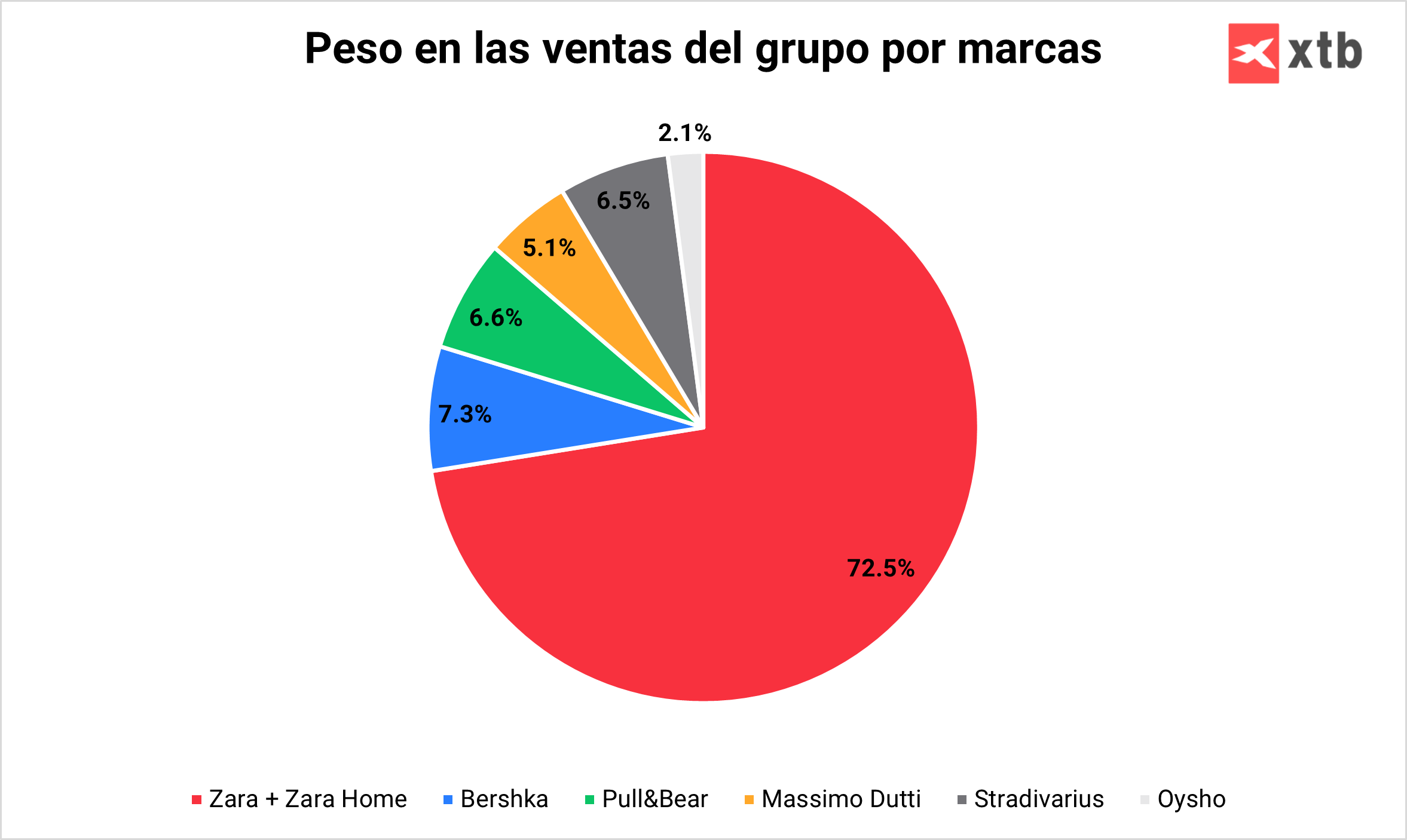 - Zara: Es la principal marca de la compañía y representa el 72,5% de las ventas y tiene un margen antes de impuestos del 19,2%. La empresa usa Zara para expandirse internacionalmente y es la marca que más tiendas tiene a nivel mundial. En ella se incluye Zara Home, centrada en productos del hogar.
