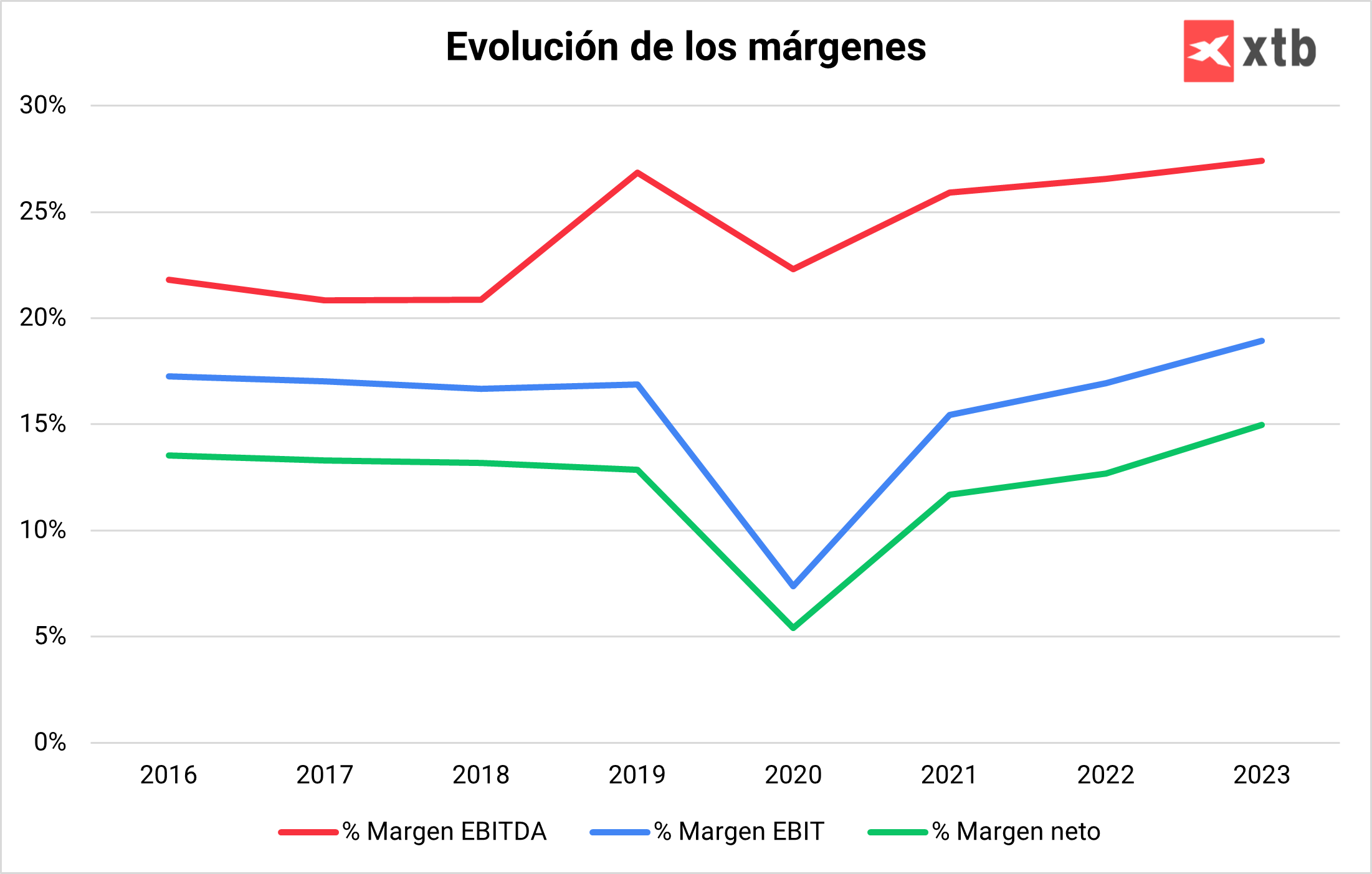 En cuanto a su situación financiera, destaca su caja neta de 11.400 millones que le permitiría liquidar todo el pasivo corriente y su capacidad para cobrar en tan solo 10 días y pagar a sus proveedores en unos 180 días. Además, el inventario tarda en venderse tan solo unos 70 días, lo que demuestra la eficiencia operativa. Esto le ha permitido ampliar los márgenes y aumentar sus beneficios a una tasa anualizada de casi el 8% desde 2016 hasta 2023