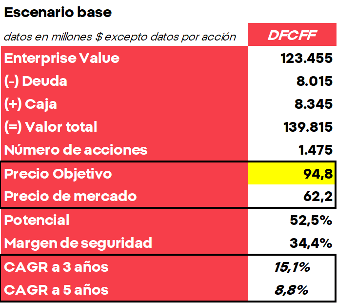 A través de un descuento de flujos de caja libre, nuestro precio objetivo para las acciones de Nike es de 94,8 dólares. Esto supone un potencial de más del 50% desde los precios actuales, lo que podría dejar una rentabilidad anualizada si se alcanzara el precio objetivo a 3 años del 15,1% y del 8,8% a 5 años.
