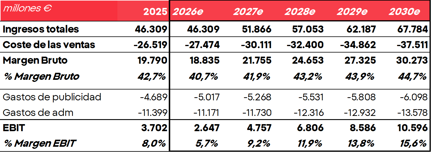 Hemos elaborado tres escenarios posibles, con el volumen y el precio como variables clave, así como el coste de las ventas para calcular el valor de las acciones de Nike. El escenario base nos parece razonable y descuenta unos ingresos planos para el 2026, mientras que en el 2027 esperamos un despunte del 12%, principalmente impulsado por un aumento del volumen tras años de un mal comportamiento y gracias a un inventario más sano. Por su parte, descontamos un deterioro del margen en este 2026 a pesar de que en la primera mitad se ha mantenido estable, ya que creemos que los eventos deportivos que tendremos en los próximos meses supondrán un aumento del gasto en publicidad adelantados
