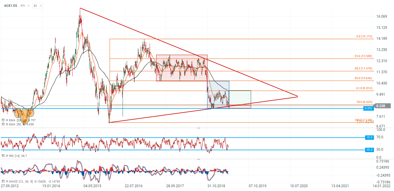 En el aspecto técnico, Cellnex se encuentra en línea con el soporte histórico, que forma una figura triangular de mínimos relativos crecientes y máximos relativos descendentes (líneas rojas). Tras haber dibujado durante un año y medio una figura lateral (recuadro rojo) finalmente lo rompió a la baja confirmando una segunda lateralidad de la misma altura (recuadro azul) que además en su línea inferior coincide con dicho soporte histórico. En este sentido se encuentra en un buen punto de entrada (a mercado) fijando un objetivo coincidente con la retrocesión del 61.8% en los 9,81€ (recuadro verde) de Fibo de la última gran subida de 2016, en línea con los últimos máximos de la lateralidad reciente.