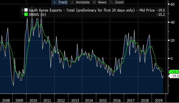Corea del Sur es una potencia comercial en Asia. Por lo tanto, este gráfico, que muestra la caída de las exportaciones, debe tomarse en serio como una referencia. Fuente: Bloomberg