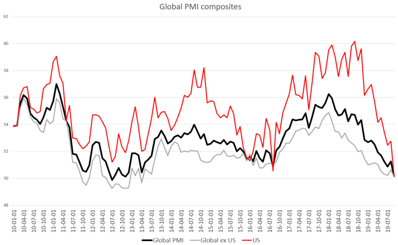 Esta semana tendrá el foco en el jueves. La economía global está al borde de la recesión a pesar de lo que muestran muchos índices bursátiles. Nuestro indice global de PMI fue menor que en septiembre solo en una ocasión, en julio de 2012, pero como sabemos en retrospectiva, un estímulo monetario masivo fue suficiente para revivir un ciclo económico aún joven. Avancemos rápidamente al presente y vemos otro esfuerzo monetario, pero en esta ocasión el ciclo es muy maduro y las tensiones comerciales no ayudan. Los inversores esperan que los PMI en Europa, especialmente Alemania, mejoren. Las huellas eclipsarán la reunión del BCE, la última con Draghi al timón. La conferencia posterior a la reunión será importante en la medida en que Draghi revele el sesgo de preferencia de la nueva Junta, pero dudamos de que esté dispuesto a discutir este punto.