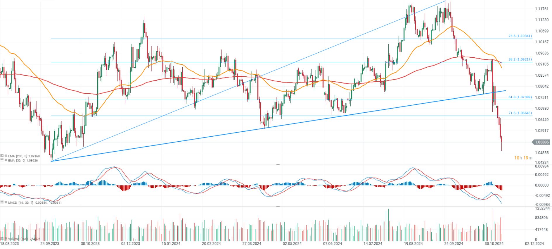 El par EUR/USD reaccionó con un movimiento alcista después de alcanzar el soporte cerca de 1,05, sin embargo, el par todavía pierde más del 0,2% hoy, mientras que el índice del dólar, el USDIDX, sube casi el 0,25%. Los rendimientos de los bonos del Tesoro estadounidense a 10 años se mantuvieron prácticamente sin cambios hoy en el 4,44%.