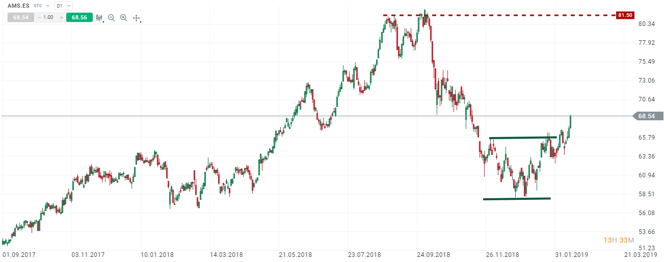 Se observa que la acción de Amadeus vuelve a la senda alcista, principalmente por las compras de Norges Bank, mayor inversor institucional de Europa, superando por primera vez el 3% del capital de Amadeus. La compra del paquete accionarial valorado en 850 millones de euros convierte a Norges en el cuarto accionista de Amadeus. La gran caída de Amadeus comenzó el pasado 1 de octubre, donde perdió un 30% de su valor. El valor puso fin a esta corrección a comienzos de 2019, coincidente con el nivel 50 de Fibonacci, tomándolo como punto de inflexión para iniciar la tendencia alcista.