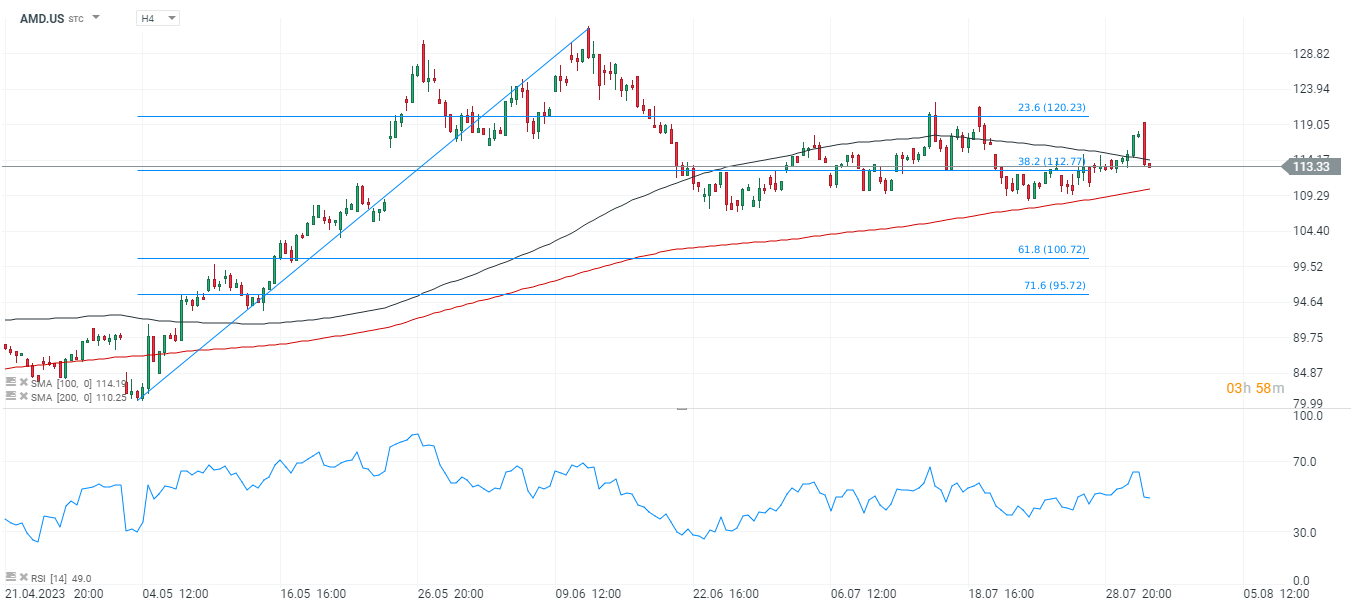 Las acciones de AMD (AMD.US) se acercan al soporte clave en 112 $ por acción, donde vemos el retroceso de Fibonacci de 38,2 % de la ola alcista de abril. Si la tendencia a la baja continúa, una nueva prueba de 100 $, el nivel de 61,8 % Fibo y la zona de apoyo psicológico, no está descartada. Fuente: xStation5