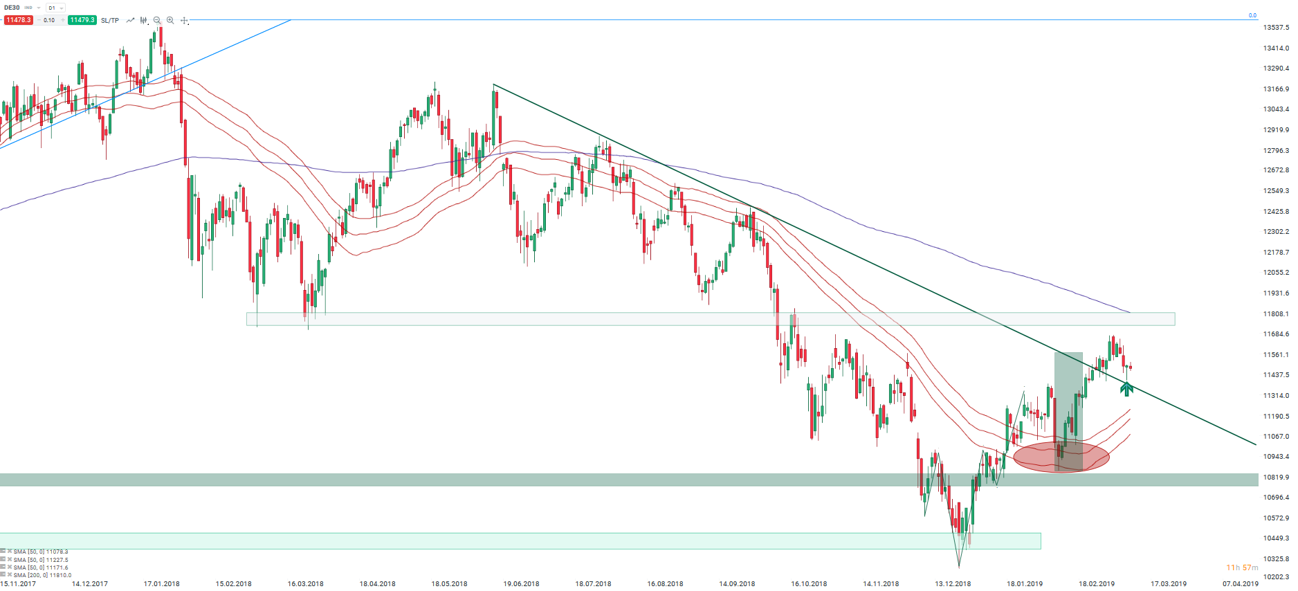 Echando un vistazo al marco diario podemos ver que el rango del patrón de cabeza y hombros invertidos ya se ha realizado. DAX (DE30) retrocedió hacia la línea de tendencia descendente que se rompió más tarde. Esta línea técnica debe servir como el soporte más cercano. Sin embargo, en el caso de que las rupturas de precios por debajo del canal de las medias móviles de 50 sesiones deban ser observadas de cerca. Recordemos que este canal logró detenerse a mediados de febrero. La combinación de la media móvil de 200 sesiones y los máximos locales a partir de 2018 en las proximidades de 11750-11800 pts. de área sigue siendo visto como el primer objetivo para los compradores.