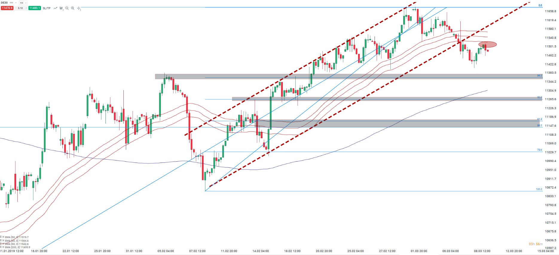 Por otro lado, la imagen se ve mucho menos optimista cuando pasamos al marco intradiario. DE30 se ha roto recientemente por debajo del canal ascendente. El índice cotiza por debajo del canal de las medias móviles de los 50 períodos en el intervalo H4. En caso de que el movimiento descendente se extienda, hay algunos niveles de soporte que hay que observar en las cercanías. El nivel de Fibo del 38,2% y los máximos locales de principios de febrero, alrededor de 1.360 puntos, deberían servir como el más cercano, mientras que el nivel de Fibo del 50% y los máximos locales de mediados de febrero se acercan a 1.260 puntos. Por último, la zona de precios entre 11160 y 11175 puntos será el último obstáculo para evitar caídas más pronunciadas. Esta zona de precios también coincide con el canal de medias móviles de 50 períodos en el intervalo D1.