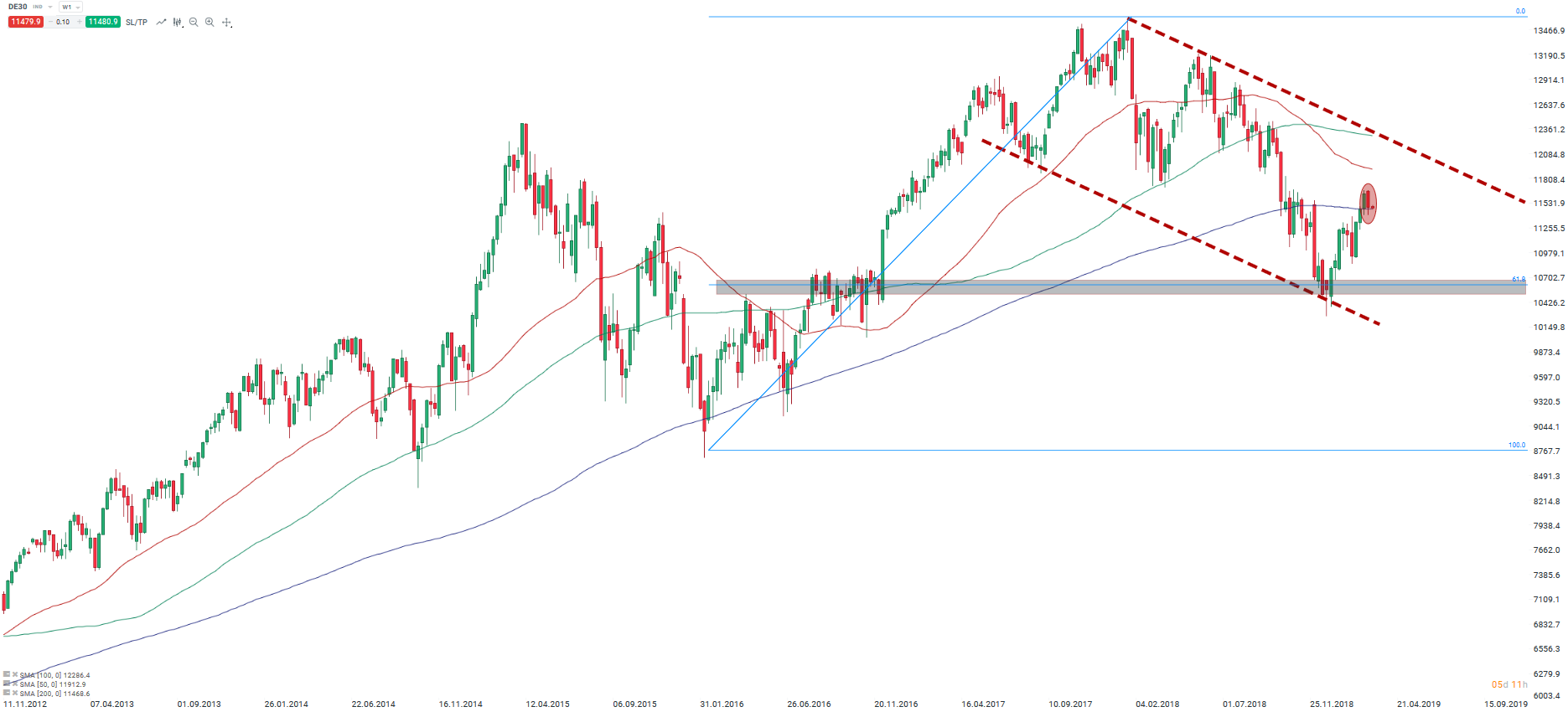 Desde nuestro último análisis técnico del 18 de febrero de 2019, el índice alemán de valores ha seguido subiendo y ha superado la media móvil de 200 semanas. La referencia cotiza dentro de un canal bajista desde principios de 2018 y actualmente se sitúa alrededor del punto medio de la anchura del canal. El límite superior del canal se encuentra en la zona de 12000 pts. En el mismo rango también se puede encontrar la media móvil de 100 semanas. Dicho esto, parece que hay espacio para más altibajos, pero para que esto ocurra es necesario que en un futuro próximo prevalezcan estados de ánimo optimistas en los mercados globales.