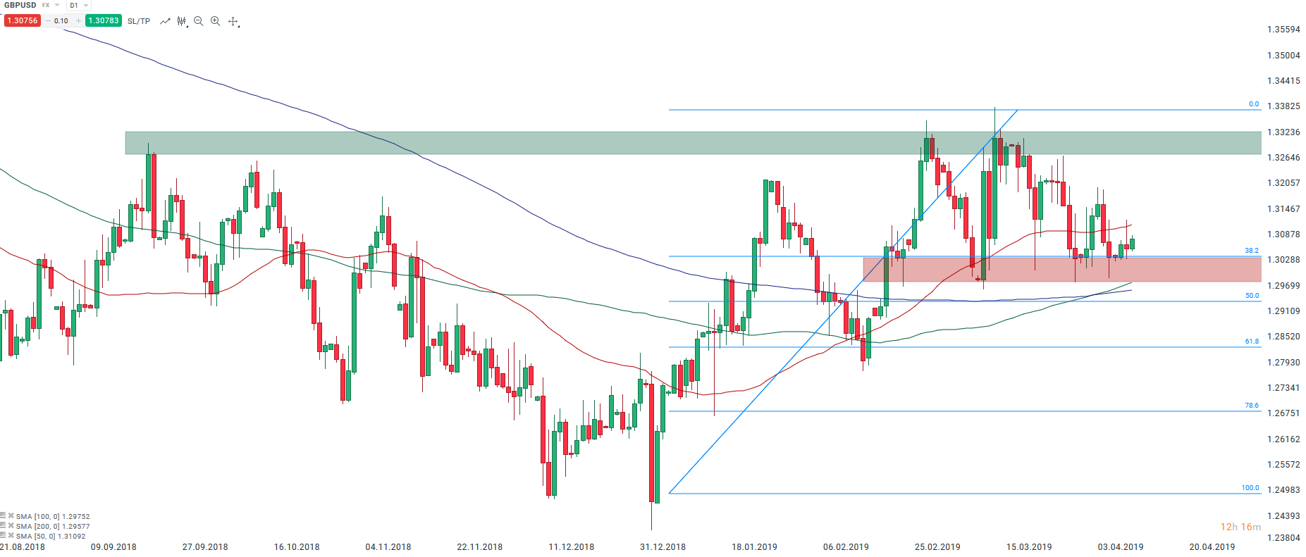 El intervalo diario es bueno para presentar la fuerte consolidación. El precio actualmente está tratando de romper por debajo de 1,30. Este nivel también está respaldado por las medias de 100 y 200, así como el retroceso del 38,2% de la última ola ascendente.