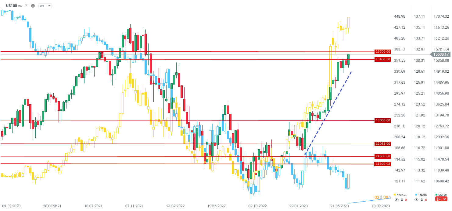 NVidia indica que el índice de tecnología puede continuar su rally. Los precios de los bonos de EE. UU. (TNOTE - gráfico azul) han comenzado un repunte que muestra mucho optimismo sobre una mayor disminución de la inflación. Fuente: xStation5