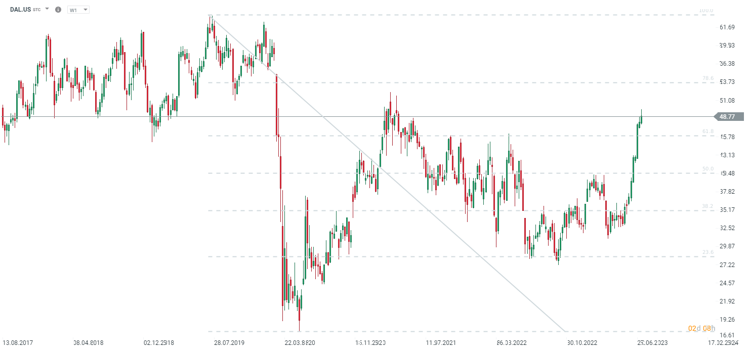 - Delta Airlines (DAL.US) está abriendo al alza y ganó casi un 4%, ya que la compañía reportó no solo resultados más fuertes de lo esperado, sino también los mejores ingresos y ganancias trimestrales de la historia. Los ingresos para el segundo trimestre de 2023 alcanzaron los 14 600 $ millones frente a los 14 400 $ millones esperados y el beneficio por acción fueron de 2,68 $ frente a los 2,41 $ esperados. Debido al repunte de la demanda de vuelos, la compañía apunta a mejores resultados en el futuro, elevando sus ganancias de todo el año a 6-7 $ en comparación con 5-6$ antes. La compañía ha subido un 3,8% al comienzo de la sesión y casi un 50% este año.