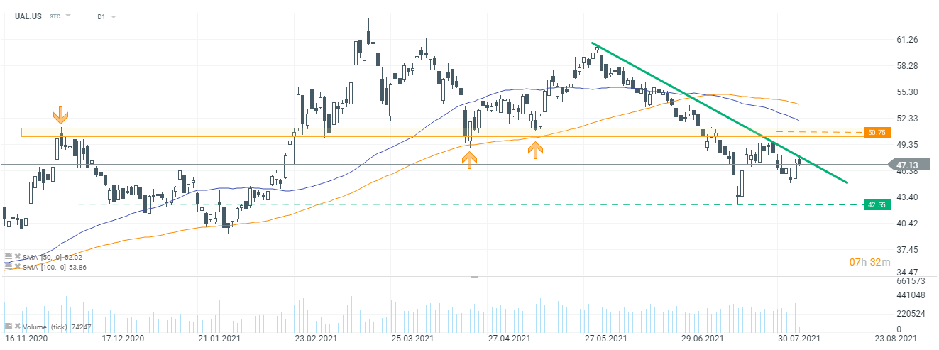 Las acciones de United Airlines (UAL.US) están tratando de recuperarse, pero hasta ahora las acciones no han podido superar la línea de tendencia a la baja. El precio rebotó del nivel de $ 42.55 en julio y pintó un mínimo más alto esta semana, una señal prometedora en términos de una secuencia potencial de mínimos y máximos más altos. Sin embargo, la línea de tendencia mencionada parece ser un obstáculo difícil para los alcistas por ahora. El área cercana a $ 50-51 puede ser otra resistencia crítica en caso de que ocurra una ruptura. Fuente: xStation5