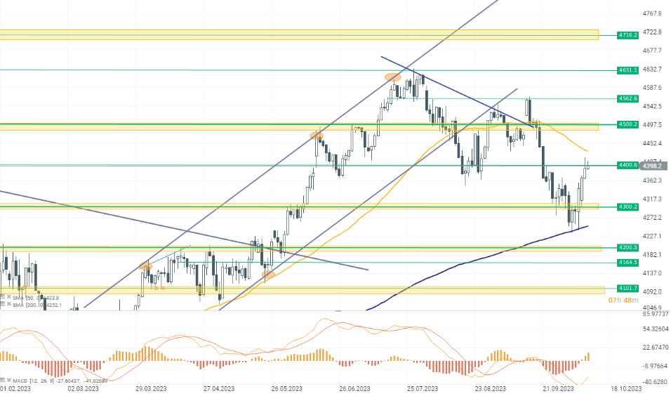 El S&P 500 cotiza actualmente a 4405 puntos, lo que supone un aumento del 0,30% hoy, lo que extiende la racha de cuatro ganancias consecutivas desde que alcanzó un mínimo local la semana pasada. El índice fue rechazado de la resistencia alrededor del nivel 4300, pero ahora ha puesto su mirada en la siguiente zona en aproximadamente 4500 puntos, lo que indica un posible retroceso del sentimiento alcista si continúa su trayectoria ascendente. Fuente: xStation 5