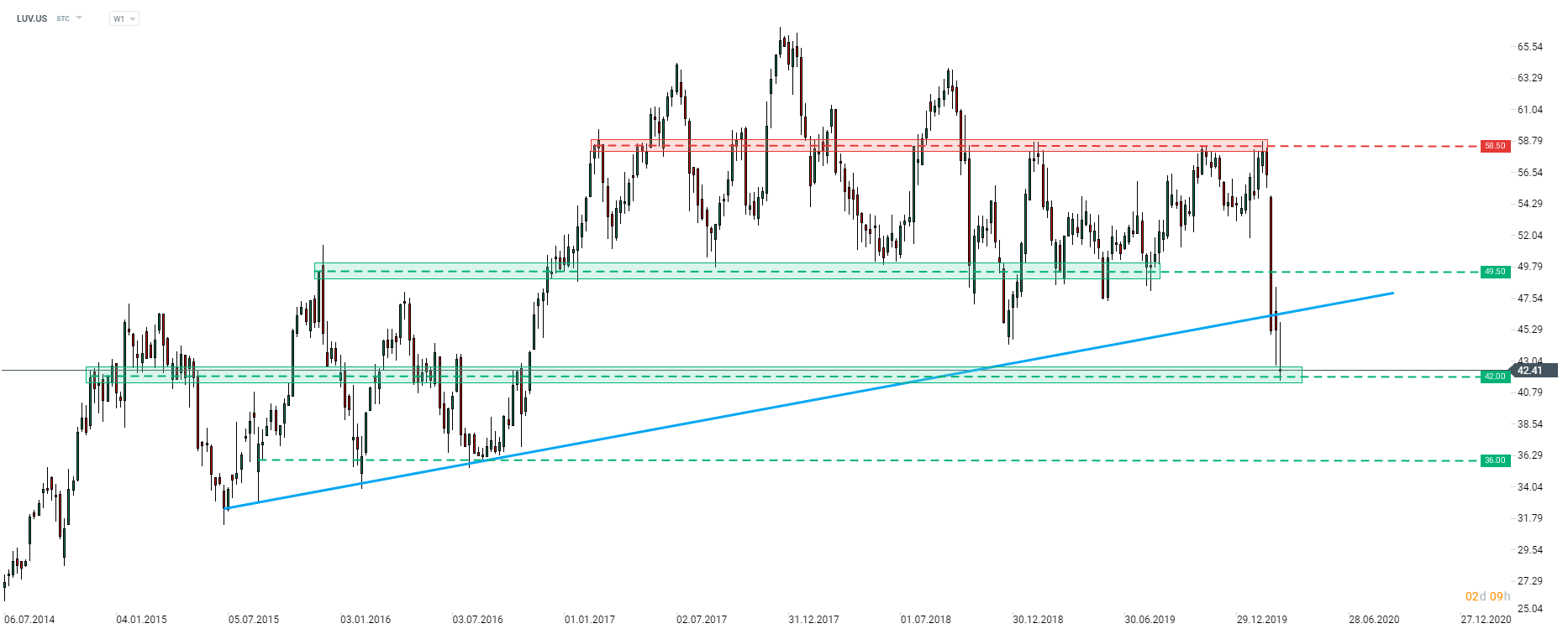 Southwest Airlines (LUV.US) rompió por debajo de la línea de tendencia al alza a principios de este mes. La acción probó la zona de soporte de 42 dólares ayer, pero es probable que la supere hoy. En tal escenario, el próximo soporte principal se puede encontrar en 36 dólares o 15% por debajo del cierre de ayer. Fuente: xStation5