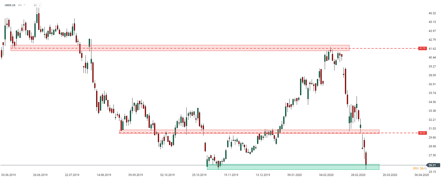 Uber (UBER.US) bajó ayer a la zona de soporte a 26 dólares y amenazó con romper el nivel más bajo. Los alcistas lograron empujar las acciones de los mínimos diarios ayer, pero teniendo en cuenta el declive del mercado previo, es probable que Uber abra en un mínimo histórico. Mientras el coronavirus se propague, la compañía puede permanecer bajo presión. Fuente: xStation5