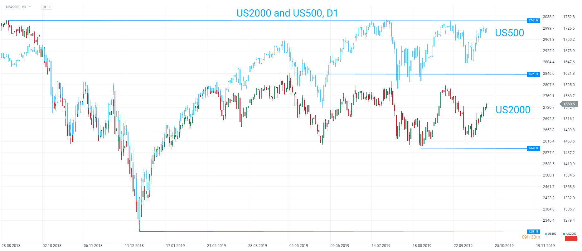 Las pequeñas compañías han tenido un rendimiento inferior al de sus pares más grandes durante gran parte de este año con una serie de máximos más bajos vistos en el US2000 desde el máximo de YTD en mayo, mientras que el US500 alcanzó su máximo en 2019 en julio y actualmente cotiza solo un 1% desde su máximo histórico. Fuente: xStation