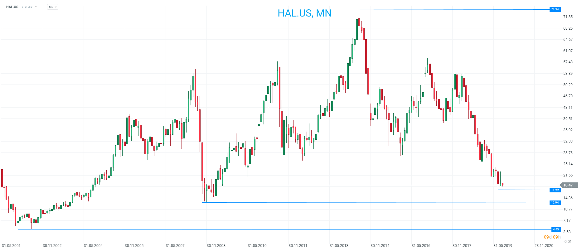 Las acciones en Halliburton han estado bajo presión en los últimos años y cayeron a su nivel más bajo desde 2009 hace solo un par de meses. Los últimos resultados no harán mucho por despertar la esperanza de una recuperación. Fuente: xStation