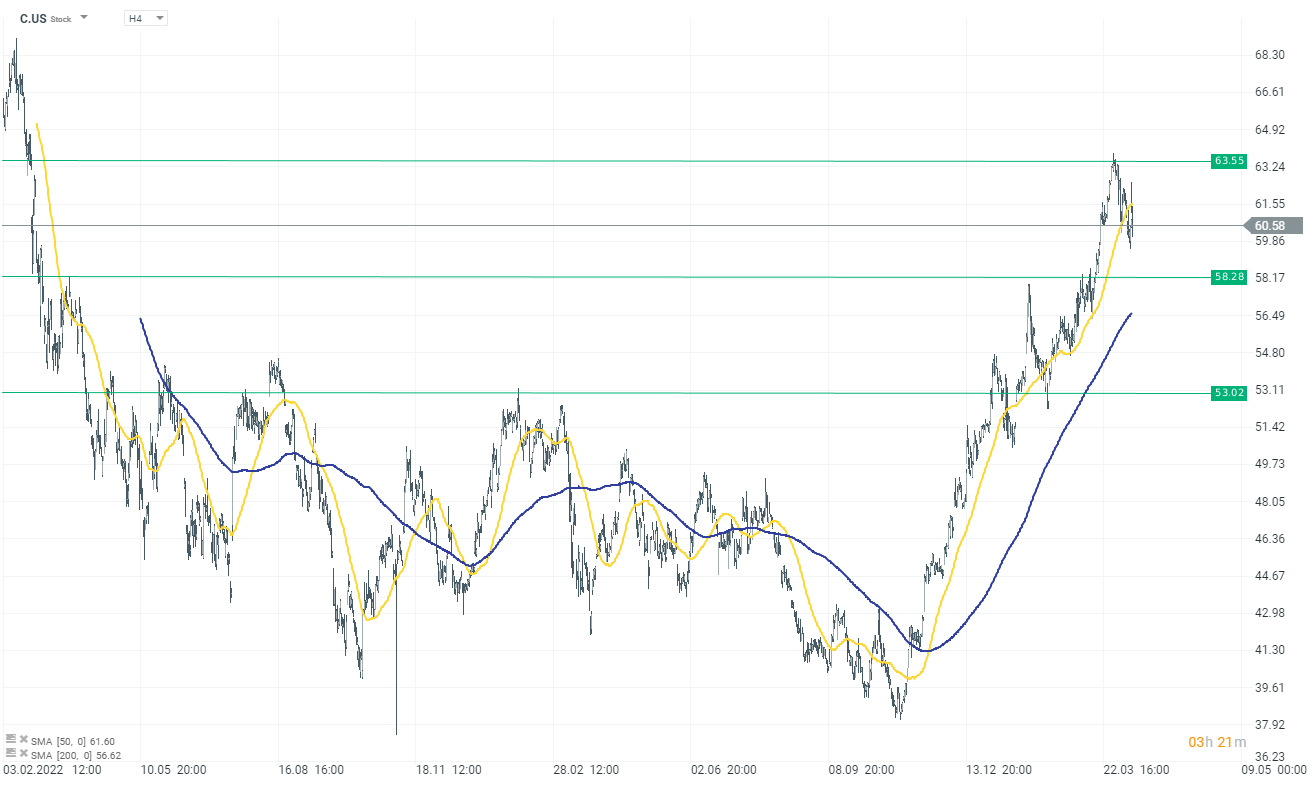 Citigroup (C.US) cae un 0,70% tras la publicación de resultados. El banco informó una disminución del 27% en sus beneficios a 3.370 millones de dólares, o 1,58 dólares por acción, impulsado por mayores gastos y costos crediticios, a pesar de unos ingresos de 21.100 millones de dólares que superaron ligeramente las expectativas debido a los sólidos resultados en la banca de inversión y el comercio. Las ganancias ajustadas fueron de 1,86 dólares por acción, superando los 1,23 dólares esperados, lo que refleja ajustes por cargos de la FDIC y otros costos. La disminución de los ingresos, un 2% menos que el año anterior, se atribuyó principalmente a la venta de un negocio en el extranjero. En particular, los ingresos de la banca de inversión aumentaron un 35% a 903 millones de dólares, mientras que el comercio de renta fija cayó un 10% y el comercio de acciones aumentó un 5%. La división de Servicios experimentó un aumento del 8% en los ingresos hasta los 4.800 millones de dólares.