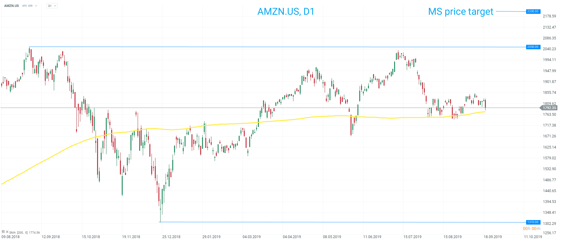 Se espera que las acciones en Amazon comiencen un poco más bajas esta tarde después de la rebaja de la valoración, aunque debe señalarse que el objetivo revisado de MS (2200) todavía está más de un 20% por encima del mercado que terminó la semana pasada. Fuente: xStation